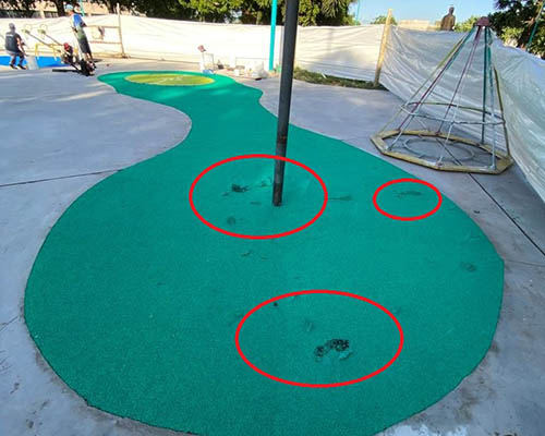 Los operarios habían permanecido colocando esta superificie hasta casi la medianoche para uq, durante la madrugada, desaprensivamente se dañó con pisadas, golpes y raspaduras, que levantaron la superficie recientemente colocada.
