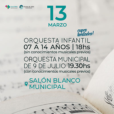 La Dirección de Cultura de la Municipalidad de Nueve de Julio abre la inscripción de interesados en sumarse a la Banda Infantil y la Banda Municipal, que iniciarán sus actividades el día 13 de marzo, con cupos limitados, en el Salón Blanco Municipal.