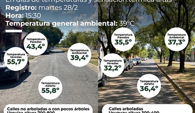 Respecto del relevamiento realizado, Cuniberti explicó que “se tomaron calles al azar, con cobertura arbórea importante y casi sin árboles, y se tomaron los datos de la superficie de la vereda, calles, de paredes y la temperatura medio ambiental, y las diferencias son enormes: pudimos ver temperaturas que suben hasta los 50 grados en lugares donde no hay árboles y temperaturas que bajan por debajo de la temperatura ambiental en los lugares donde hay buena cobertura de sombra”.