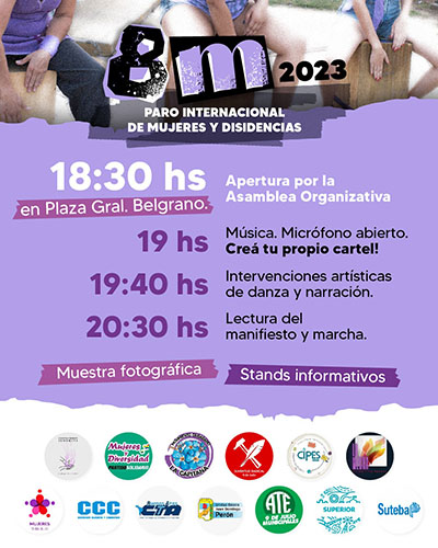 La Asamblea General Organizativa del 8M 2023 invita a las mujeres de Nueve de Julio a la jornada en el marco del Paro Internacional de la mujer y disidencias trabajadoras.