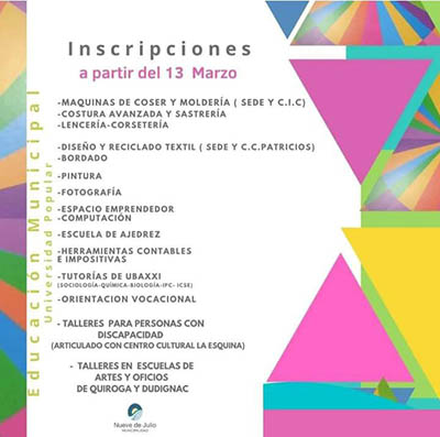 El  lunes 13 del corriente, abrirán las inscripciones para los cursos y talleres que se ofrecen en la Universidad Popular.