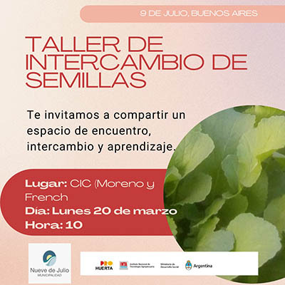 La Municipalidad de Nueve de Julio, junto a Pro Huerta, INTA y el Ministerio de Desarrollo Social, lleva adelante un taller de intercambio de semilla, espacio de encuentro y aprendizaje, que se llevará adelante el próximo lunes 20 del corriente, a las 10 hs., en el Centro Integrador Comunitario (CIC), de calles Moreno y French.