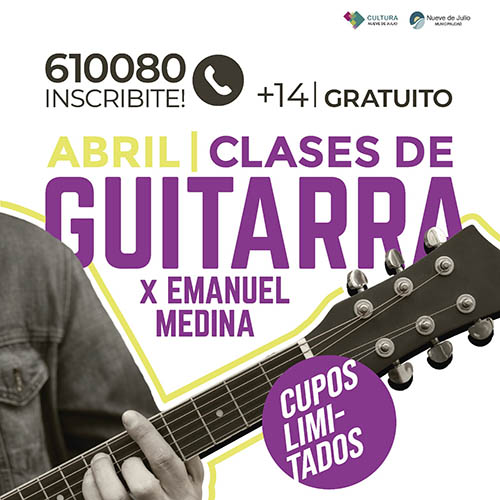 La Municipalidad de Nueve de Julio, a través de la Dirección de Cultura, dictará clases gratuitas de guitarra, para mayores de 14 años de edad, a cargo del Prof. Emanuel Medina.
