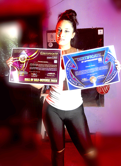 En segundo lugar, fue ingresada como profesional participante del Escuadrón Mundial de Fuerzas Especiales temporada 2023, del grupo internacional de estudios, extensiones, investigación avanzada, excelencia práctica, debates, eventos, capacitaciones, perfeccionamientos y demás acciones a favor de la defensa personal policial, militar y civil. y las artes marciales del mundo.