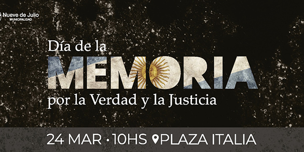 Al conmemorarse hoy, viernes 24 el Día Nacional de la Memoria por la Verdad y la Justicia, la Municipalidad de Nueve de Julio habrá de desarrollar los actos alusivos a la fecha, desde las 10 hs. en Plaza Italia, con el siguiente cronograma: