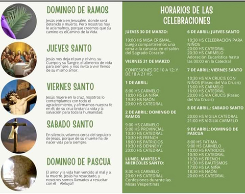 A lo largo de la semana, en tanto, entre lunes y miércoles, oficiarán misas en el Carmelo, a las 8 y 20; el Jueves Santo se realizará a las 10,30 la celebración para los niños en la Iglesia Catedral; y, posteriormente, a las 20 habrá celebración en Catedral y 20,30 en el Carmelo. Luego se desarrollará la adoración eucarística hasta la medianoche.