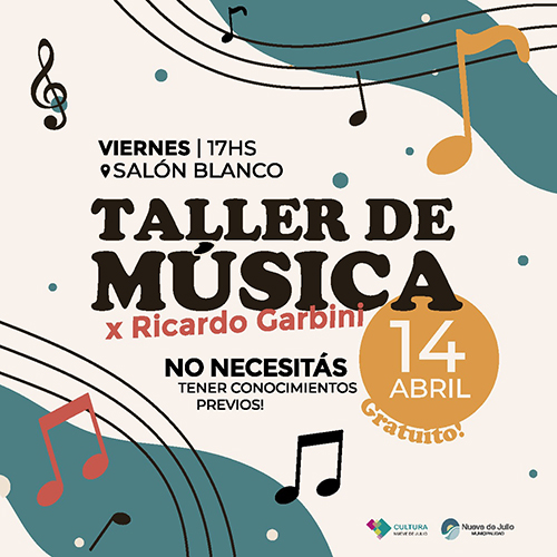 La Municipalidad de Nueve de Julio, a través de la Secretaría de Cultura, Educación y Deportes, invita a los interesados en cantar o ejecutar un instrumento a sumarse al Taller de Música, a cargo del Prof. Ricardo Garbini, no siendo necesario contar con conocimientos previos.