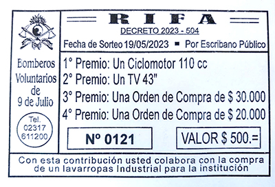Con el objetivo de adquirir un lavarropas industrial para evitar que los integrantes del cuerpo activo lleven a lavar la ropa a sus casas, con restos de hollín y la toxicidad que esto implica, la Asociación de Bomberos Voluntarios de 9 de Julio se encuentra poniendo a la venta una nueva rifa.