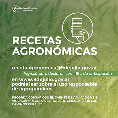 La dirección municipal de Espacios Verdes invita a profesionales y productores a declarar las recetas agronómicas de aplicación, situación de carácter obligatorio, a través del correo electrónico [email protected]; a la vez que se los insta a ingresar a la página del municipio https://www.9dejulio.gov.ar a leer el link sobre el uso responsable de agroquímicos.