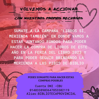 Los interesados en sumarse podrán hacer llegar sus donaciones a la Caja de Ahorro de alias “bibliotecaprovincial” (sin espacios), siendo bienvenido cualquier aporte que sea posible.
