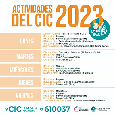La Municipalidad de Nueve de Julio, a través de la secretaría de Desarrollo Comunitario, invita a participar de las variadas actividades abiertas a la comunidad que se llevan a cabo en el Centro Integrador Comunitario (CIC), de calles French y Moreno.