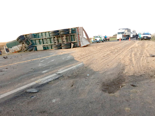 Alrededor de las 17 horas de ayer lunes, un camión con acoplado chocó contra un vehículo y volcó su acoplado que quedó cruzado en la calzada de la ruta Nacional N° 5.
