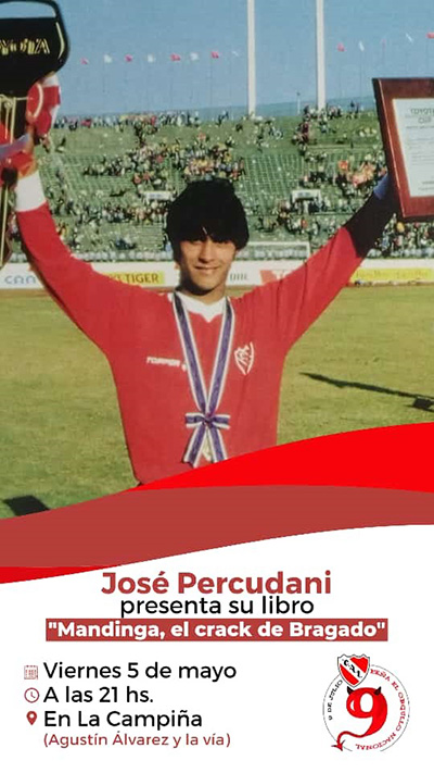 Esta noche a las 21 en el complejo deportivo “La Campiña”, de A. Alvarez y vías del ferrocarril, y a través de la Peña del Club Atlético Independiente de Avellaneda en 9 de Julio “El Orgullo Nacional”, se presentará el libro “Mandinga, el crack de Bragado”, que narra la vida deportiva del futbolista bragadense José Percudani y su exitosa trayectoria en los Rojos, donde es ídolo absoluto