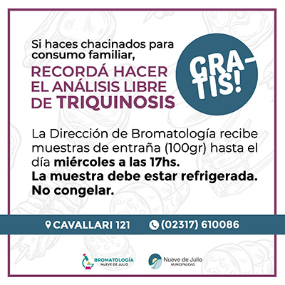La Dirección de Bromatología de la Municipalidad de Nueve de Julio recuerda a los vecinos que realicen chacinados para consumo familiar, que deben realizar el análisis de triquinosis, que se efectúa de manera totalmente gratuita.