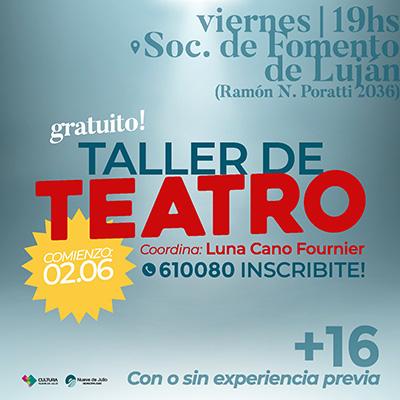 La dirección municipal de Cultura informa que pondrá en marcha el viernes 2 de junio un nuevo taller gratuito de teatro, que se dictará en la Sociedad de Fomento de Barrio Luján, ubicada en calle Ramón N. Poratti 2036.
