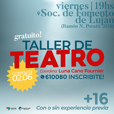La Dirección de Cultura de la Municipalidad de Nueve de Julio pondrá en marcha, el viernes 2 de junio, un nuevo taller gratuito de teatro, que se dictará en la Sociedad de Fomento de barrio Luján, ubicada en calle Ramón N. Poratti 2036 y que será coordinado por Luna Cano Fournier.