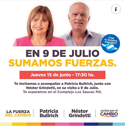 A través de las redes sociales Patricia Bullrrich, difundió que llegará el próximo jueves 15 de junio a la ciudad de Nueve de Julio. Lo hará acompañada por Néstor Grindetti,e invitó a los simpatizantes a acompañarlos a partir de las 17:30 en el complejo Los Sauces MX.