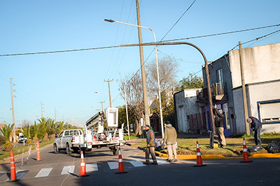 La Municipalidad de Nueve de Julio está instalando un nuevo semáforo en la intersección de Urquiza y San Juan, donde ya fueron instaladas las columnas y pintadas las sendas peatonales, mientras que ayer por la mañana ya estuvo instalando los artefactos lumínicos.