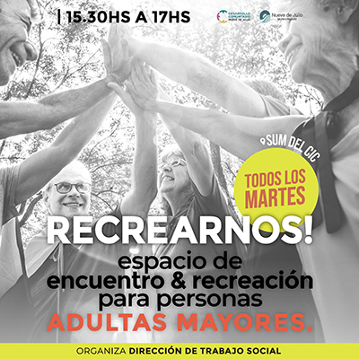 La dirección de Trabajo Social, dependiente de la secretaría de Desarrollo Comunitario, invita a las personas adultas mayores a participar de “Recrearnos”, un nuevo espacio que se dictará todos los martes, a partir del 27 de junio, de 15: 30 a 17 en el SUM del Centro Integrador Comunitario (CIC)”Martín Callegaro”, ubicado entre las calles French y Moreno.