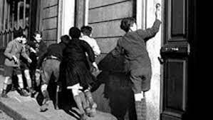 Interpreto que todos en nuestras vidas hemos pasado por dicha etapa y que normalmente hemos practicado esta travesura… tocar el timbre de una casa y salir corriendo para observar de lejos si alguien ha salido a mirar y posiblemente con algún gesto intimidatorio… mostrar por ejemplo una escoba en las manos o similar de quien se ha sentido molesto… molesta y bueno así terminó en forma positiva la travesura ya hecha y el actor continuará caminando como si nada… solo o con el grupito de chicos que normalmente lo acompañan… algo así como con el deber cumplido.