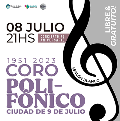El Coro Polifónico Ciudad de Nueve de Julio habrá de celebrar sus 72 años de ininterrumpida trayectoria en la comunidad con un gran concierto, a desarrollarse el sábado 8 de julio, a las 21 hs., en el Salón Blanco del Palacio Municipal, con entrada libre y gratuita.