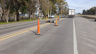La Policía Comunal informó sobre un accidente de tránsito registrado en la tarde del miércoles en la Ruta Nacional N° 5 KM 262,300, donde se produjo una colisión entre una motocicleta Motomel Sxhua 150, (conducida por un joven de 24 años, oriundo de Nueve de Julio que se movilizaba en sentido ascendente), y un automóvil marca Chevrolet Cruze, (conducido por un hombre de 69 años, oriundo de lTres Lomas), quien se encontraba transitando en sentido ascendente.