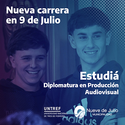 La Municipalidad de Nueve de Julio comunica que a partir del día de ayer se encuentra abierta la inscripción para dos diplomaturas que se dictarán en las aulas del Centro de Desarrollo Productivo “San Cayetano”, en el marco del Programa Puentes, a través de la Universidad Nacional de Tres de Febrero. Se trata de las diplomaturas en Desarrollo Web Frontend y Producción Audiovisual, que se dictarán a partir del 21 y 22 de agosto respectivamente.
