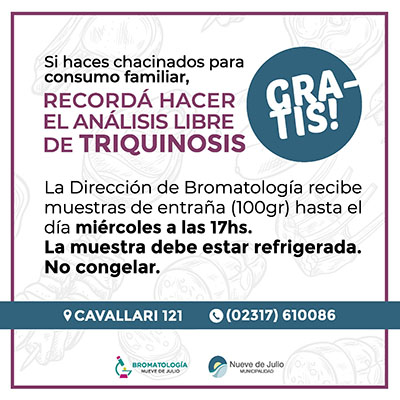 Ante la decisión del Gobierno bonaerense de emitir una alerta epidemiológica, tras la detección de 15 casos con síntomas sospechosos de triquinosis en los municipios de Adolfo Alsina y Salliqueló, la Municipalidad de Nueve de Julio, a través de la Dirección General de Bromatología recuerda: