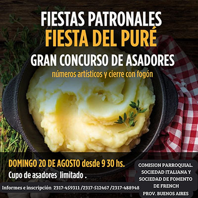 Instituciones de la localidad de French aceleran los preparativos de una nueva edición de la Fiesta del Puré, tradicional evento distintivo de la comunidad, que en esta oportunidad comprenderá la realización de un gran Concurso de Asadores y las Fiestas Patronales, el próximo domingo 20.