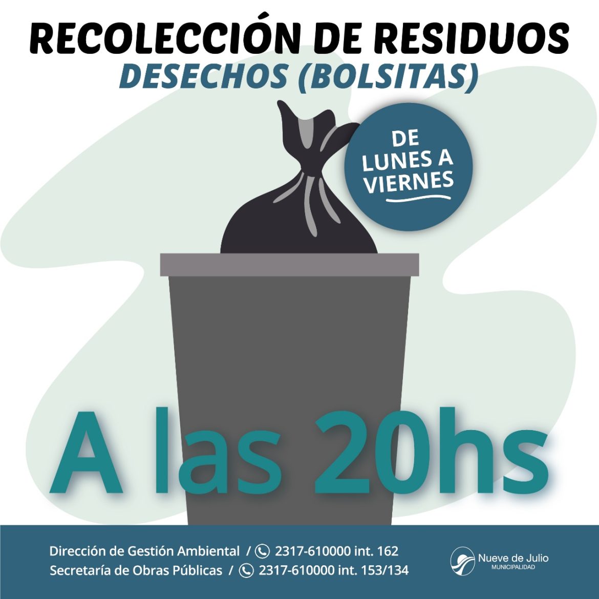 La Municipalidad de Nueve de Julio, a través de la secretaría de Obras y Servicios Públicos, recuerda que la recolección de residuos domiciliarios perecederos (bolsitas), se realizará desde las 20 horas en adelante; solicitándose a los frentistas sacar los mismos antes de este horario.