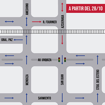 – Queda establecido el sentido de circulación único para las calles Azcuénaga entre Rastreador Fournier y Vías del Ferrocarril Sarmiento y su continuación; es decir, San Juan entre vías de Ferrocarril Sarmiento y Av. Urquiza, en dirección Ruta 5 hacia el centro de la ciudad; en sentido ascendente.