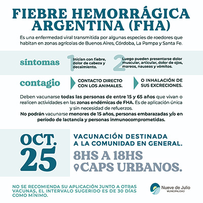 La secretaría municipal de Salud, se encuentra está llevando adelante una nueva campaña de vacunación contra la Fiebre Hemorrágica Argentina (Mal de los Rastrojos), causada por el virus Junín, y transmitida por el contacto directo con roedores o inhalación de sus excreciones (saliva u orina).