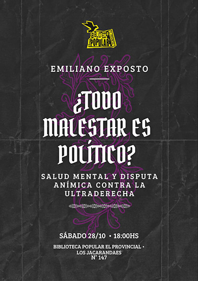Odio, resentimiento, decepción, bronca, miedo, esperanza, venganza, entusiasmo, resignación, alegría, humillación, amor, desilusión, desesperación, felicidad. El análisis de la coyuntura política argentina esta cargado de un lenguaje que busca en los sentimientos y las pasiones las claves de comprensión afectiva de las profundas transformaciones de la sociedad y las formas de vida contemporáneas. Las fuerzas de ultra-derecha en el mundo y en nuestro país intentan ser explicadas por su capacidad para “capturar”, “canalizar” o “representar” el malestar social. ¿La ultra-derecha politiza el malestar? ¿Qué imágenes de felicidad proponen? ¿Cuáles son sus promesas de disfrute y consumo? ¿Cuáles son nuestras políticas del malestar y del disfrute? ¿Los lideres de la extrema derecha están locos? ¿Es el delirio una energía política a disputar? Este encuentro propone una entrada a la coyuntura política a partir del punto de vista de nuestra salud mental y de las emociones de la vida cotidiana. La hipótesis es que la disputa electoral tiene un reverso sensible: la disputa anímica. ¿Nuestros estados de ánimo, como la ansiedad, la impotencia, la depresión, el entusiasmo o la ilusión, son territorios para investigar el presente? ¿Pueden ser potencias individuales y colectivas para intervenir en la actualidad? En la disputa anímica germinan las imaginaciones, los fracasos y los ensayos para inventar nuevas prácticas culturales y políticas que restituyan nuestra confianza en que podemos pensar y actuar contra la ultra-derecha.