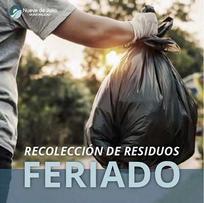 La Municipalidad de Nueve de Julio informa que, durante la jornada del lunes 20, feriado nacional en conmemoración del Día de la Soberanía Nacional, la recolección de residuos domiciliarios perecederos (bolsitas) SERÁ NORMAL en toda la ciudad, como se hace diariamente, a partir de las 20.
