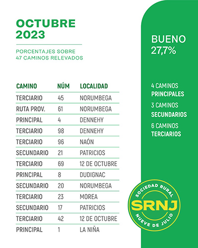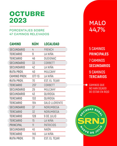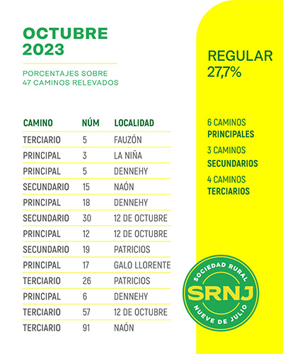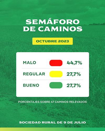 Sociedad Rural de Nueve de Julio dio a conocer el estado del Semáforo de Caminos Rurales del distrito, correspondiente a octubre 2023, a partir de un relevamiento que dan a conocer los mismos productores, en esta oportunidad, 47 caminos y que representa un 37% del total, esto es más de 700 kms. de red vial rural.