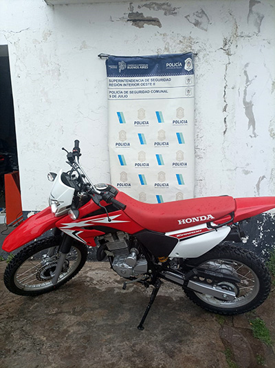 La Estación de Policía Comunal de 9 de Julio informó que tras recibir el lunes pasado una denuncia penal del propietario de comercio cuya razón social resulta ser “Cingolani Motors”, ubicado en Mendoza Nº803, que poseía vidriera dañada con un elemento contundente, constató que faltaba una moto marca Honda, modelo XR 250 NEW, de color rojo. Tras ello la policía realizó distintas actuaciones que arrojaron un resultado positivo.