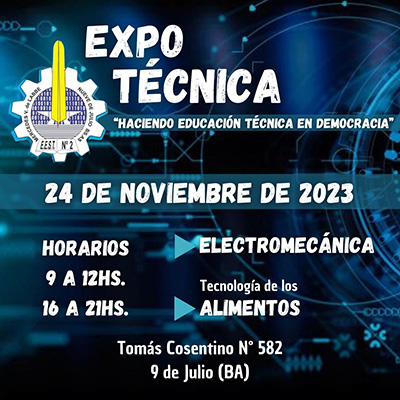 Este viernes 24, de 9 a 12 y de 16 a 22, la Escuela de Educación Técnica Nº 2 realizará una nueva edición de su tradicional Expo Técnica, donde los alumnos de las especialidades de Tecnologías de los Alimentos y Electromecánica exhibirán sus producciones anuales ante la comunidad.