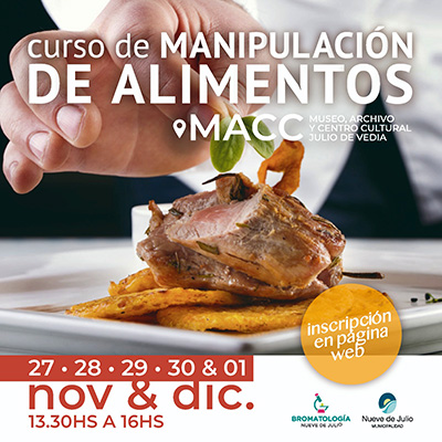 La dirección de Bromatología de la Municipalidad de Nueve de Julio informa que se encuentra abierta la inscripción para el nuevo curso gratuito de manipuladores de alimentos que se dictará entre los días 27 de noviembre y 1º de diciembre, de 13,30 a 16,00 en lel museo.