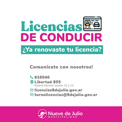 La Oficina de Licencias de Conducir de la Municipalidad de Nueve de Julio informa que las Licencias con vencimiento próximo, deben solicitar turno 30 días antes del vencimiento, enviando fotos del DNI y la Licencia de ambos lados únicamente al mail [email protected]
