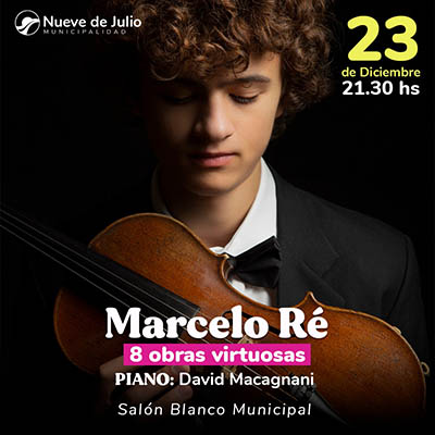 El sábado 23 de diciembre, a las 21,30 hs., en el Salón Blanco del Palacio Municipal, se presentará el joven violinista de raíces nuevejulienses, Marcelo Ré; quien reside en España y ha recorrido los principales escenarios europeos; quien estará acompañado en la oportunidad por David Maccagnani en piano.