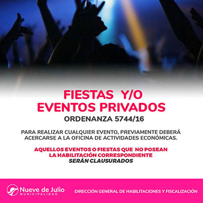 La dirección municipal de Habilitaciones y Fiscalización, recuerda la plena vigencia de la Ordenanza 5744, del año 2016, que regula la realización de fiestas y/o eventos privados, la que tiene por objeto “regular las fiestas y/o eventos que se desarrollen en inmuebles de dominio privado, ya sean vivienda particular, quinta, casa de campo, finca, galpón o cualquier otro tipo similar, situado dentro del Partido de Nueve de Julio; que sean abiertas al público en general, concurran más de 100 personas, y se cobre un canon, entrada o retribución de cualquier tipo y en cualquier momento; y/o se comercialicen bebidas y/o comidas…”.