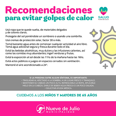 Ante las altas temperaturas registradas, la secretaría de Salud de la Municipalidad de Nueve de Julio recomienda tomar los cuidados necesarios para prevenir el golpe de calor. Hay que tener en cuenta que puede afectar a personas de cualquier edad, pero los grupos de mayor riesgo son los niños -que no manifiestan sus síntomas con facilidad- y los mayores de 65 años.