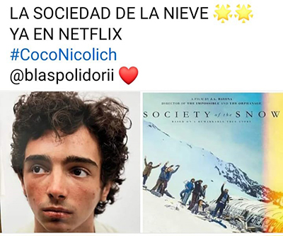 Así lo manifestó el joven actor nuevejuliense, que fue parte del elenco de la película “La Sociedad de la nieve”. El film es una nueva versión de la cruda experiencia de los rugbierse argentinos, sobrevivientes del vuelo 571 de la Fuerza Aérea Uruguaya tras caerse en la cordillera de los Andes en 1972 .