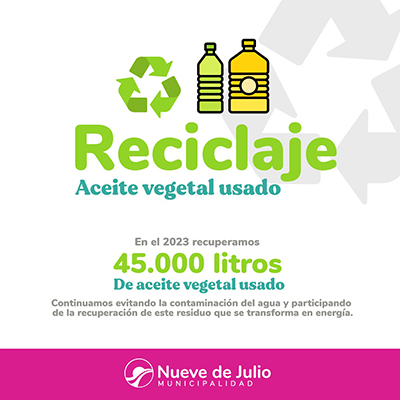 La Municipalidad de Nueve de Julio, a través de la dirección de Gestión Ambiental informa que, durante el año 2023 se recolectaron 45.000 litros de aceite vegetal usado, que retiró la empresa RBA ambiental y que será reciclado en la fabricación de biocombustibles, evitando de esta manera la contaminación del agua.
