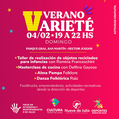 Tras el lanzamiento de la convocatoria de artistas, la Municipalidad de Nueve de Julio, a través de la Dirección General de Cultura, presentará este domingo 4 de febrero, “Verano Varieté”, una propuesta a desarrollarse en el Parque General San Martín, entre las 19 y las 22 hs.