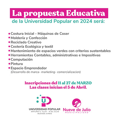La Universidad Popular de 9 de Julio lanza su propuesta educativa para el presente año, con una interesante variedad de propuestas para los distintos intereses de la comunidad.