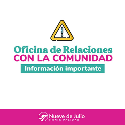 La Oficina de Relaciones con la Comunidad de la Municipalidad de Nueve de Julio recuerda a las entidades de bien público, que desde febrero la dirección provincial de Personas Jurídicas retoma la recepción de la documentación reglamentaria que deben presentar las instituciones anualmente, así como aquellas que se encuentran en proceso de condonación y normalización.