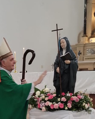 Partiendo de los textos bíblicos de la misa dominical y haciendo referencia a lo dicho por el Santo Padre en la homilía de la canonización, el Pastor diocesano propuso la vida y las actitudes de la nueva santa como testimonio y ejemplo actual y vigente. “Encontramos en ella un modelo acabado de mujer, cristiana y misionera”, comenzó su predicación. Con perseverancia y audacia supo y pudo superar los condicionamientos de la época para llevar adelante su propósito evangelizador. Las contrariedades, las distancias o los obstáculos no la amedrentaron. En ella se encuentra un ejemplo de esperanza que produce constancia y nos ayuda a no bajar los brazos. Es modelo de cristiana, laica, comprometida con el quehacer apostólico, en la difusión y predicación de los Ejercicios espirituales de San Ignacio, continuando la obra de la Compañía de Jesús que había sido expulsada recientemente de las colonias españolas. En este senti-do en todo un testimonio y, a la vez, una valiosa intercesora para las mujeres que también hoy siguen sosteniendo y dando impulso a la vida de nuestras comunidades. “¡Qué sería de nuestras parroquias sin las catequistas, sin las incontables mujeres que le dan vida a nuestras comunidades!” afirmó el Prelado diocesano. Finalmente, puso de relieve la obra misionera de la nueva santa, con su pasión por hacer que la mayor cantidad de personas de cualquier condición y procedencia, pudiesen hacer la expe-riencia de los ejercicios espirituales ignacianos. También hoy, aún en otro contexto cultural tan distinto, ayudar a otros a tener una experiencia espiritual que renueve y transforme la vida recuperando la gracia, sigue siendo uno de los caminos más fecun-do y eficaces de la pastoral. “¡La santa nos muestra un camino, un método, que sepa-mos imitarla también en esto!” exhortó monseñor Ariel.
