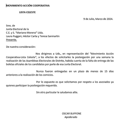 La Lista Celeste “Movimiento Acción Cooperativa-Lista Celeste”, solicitó mediante una nota la postergación por una semana de la realización de las Asambleas Electorales de Distrito, debido aque la Junta Electoral no entregó aún las boletas oficiales de los candidatos.“Nunca fueron entregadas en un plazo de menos de 15 días anteriores a la realización de los comicios”, señalaron desde la Lista.