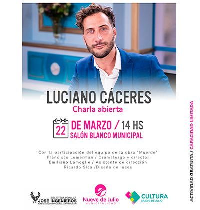 La Municipalidad de Nueve de Julio, a través de la dirección general de Cultura, y de manera conjunta con la Biblioteca Popular José Ingenieros, llevará adelante, el viernes 22 del corriente una charla abierta a la comunidad con el actor Luciano Cáceres y su equipo, para contar sobre su vida, su profesión y establecer un interesante diálogo con los integrantes del espectáculo que lo trae de visita a nuestra ciudad. El encuentro será libre y gratuito, y se realizará en el Salón Blanco del Palacio Municipal, a las 14 hs, con localidades hasta agotar el aforo, y por orden de llegada, desde las 13.45 hs.